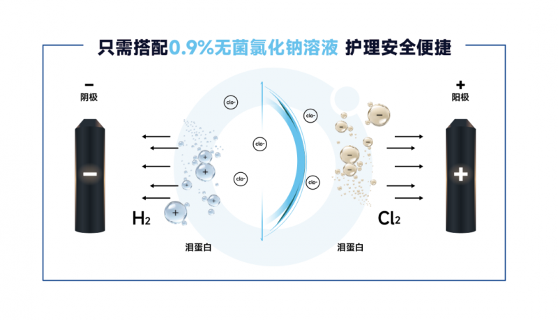 Elepy®是「镜净GP」硬性接触镜护理消毒仪的核心专利技术,它利用蛋白质在电场中带电泳动的特性,让其在电场作用下定向脱离镜片,再通过“电化学解离”的作用原理,解离生理盐水产生含氯消毒溶液,可以进一步分裂蛋白质肽键,将大分子蛋白打散成小分子,更利于电场力牵引蛋白质,达到高效除蛋白的功能。且含氯溶液可以破坏病菌遗传物质,达到灭活病菌的作用。Elepy® is the core patented tech of the 「ReO2 GP」 rigid contact lens care and disinfection device. It uses the characteristic of protein electrophoresis in an electric field to detach proteins from lenses. Then, via electrochemical dissociation, it splits saline into a chlorine-based disinfectant. This solution breaks protein bonds, turning large proteins into smaller ones for easier removal, effectively achieving efficient protein removal. Also, the chlorine solution destroys pathogens' genetic material, inactivating them.