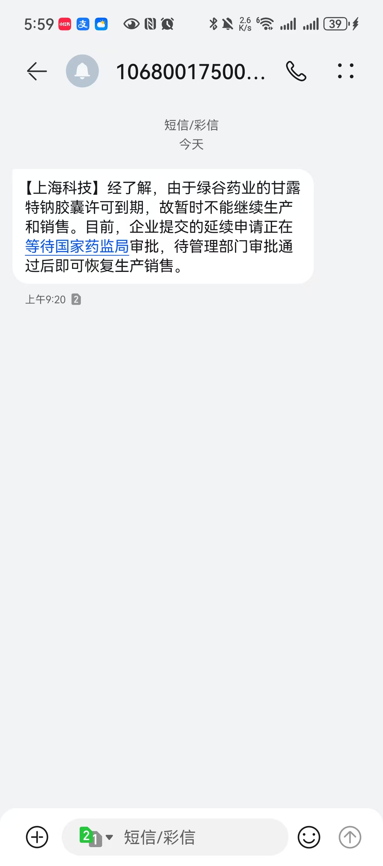 吴小姐进一步表示,在5月28日当天,在向12345平台反馈后,她还收到了一则手机短信:经了解,由于绿谷药业的甘露特钠胶囊许可到期,故暂时不能继续生产和销售。目前,企业提交的延续申请正在等待国家药监局审批,待管理部门审批通过后即可恢复生产销售。