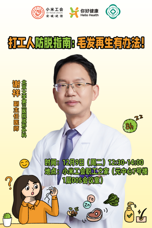 “你看以前那些吃不上饭的,还有战争年代那么艰苦,很多人不脱发,头发都很好,反而像查尔斯王子,或者是一些生活很优越的人,却脱发严重。”12月9日中午,北京大学第三医院成形外科谢详医生在小米工会职工之家,为职工们带来了《打工人防脱指南:毛发再生有办法!》主题讲座,他以幽默的开场为大家逐步揭开脱发的科学真相。
